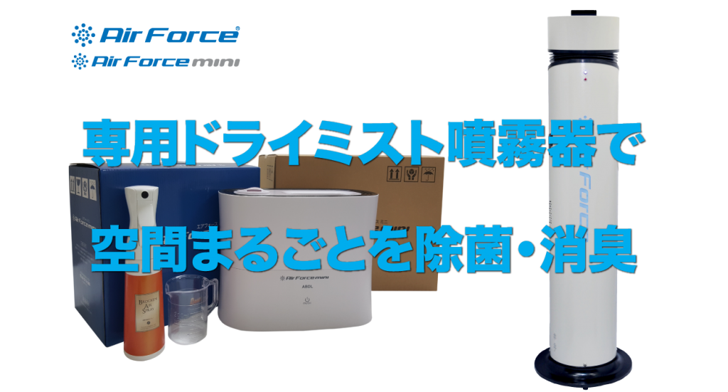 ドライミスト噴霧機【エアフォース】で細かい粒子で噴霧して空間全体を除菌。広さに応じて小型の【エアフォース ミニ】もあります。