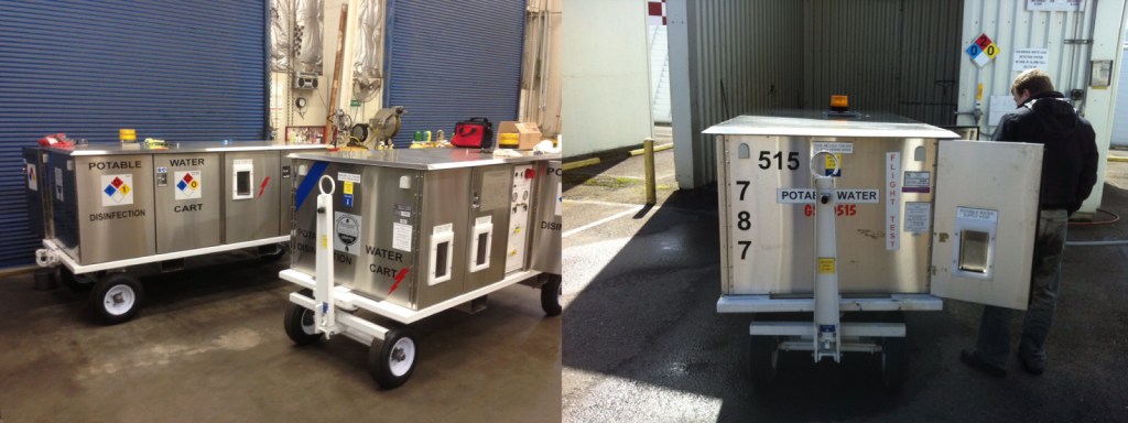 この写真は、世界各国に着陸した後に現地の飲料水をより安全・安心にするために水質浄化をしたものをボーイング(BOEING)機の中に入れるために各空港に配備している写真です。
